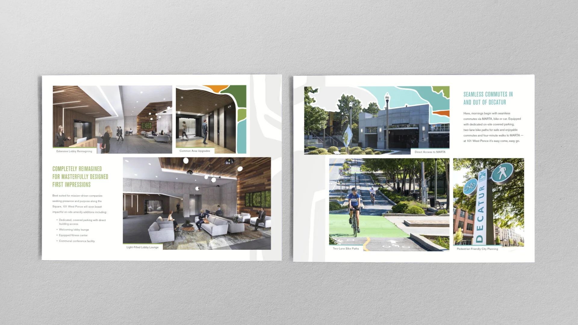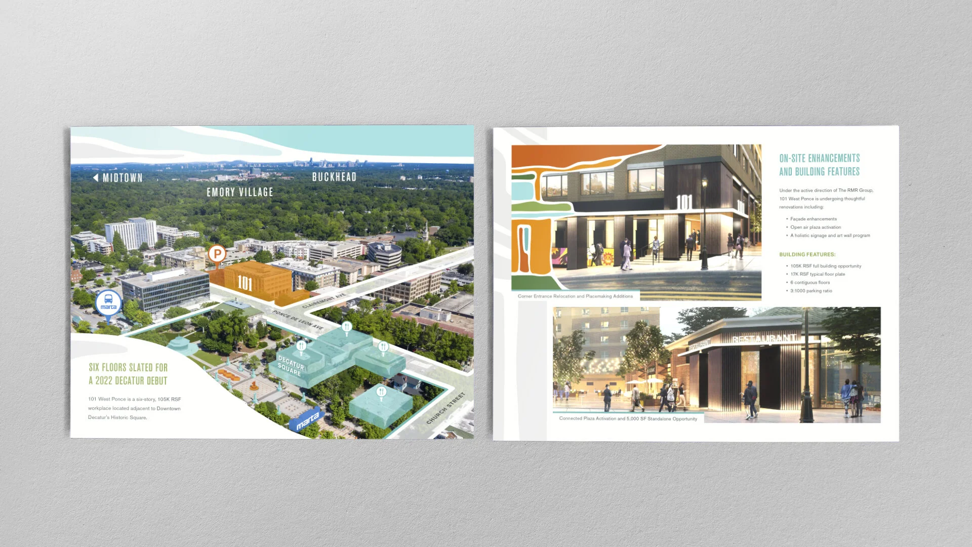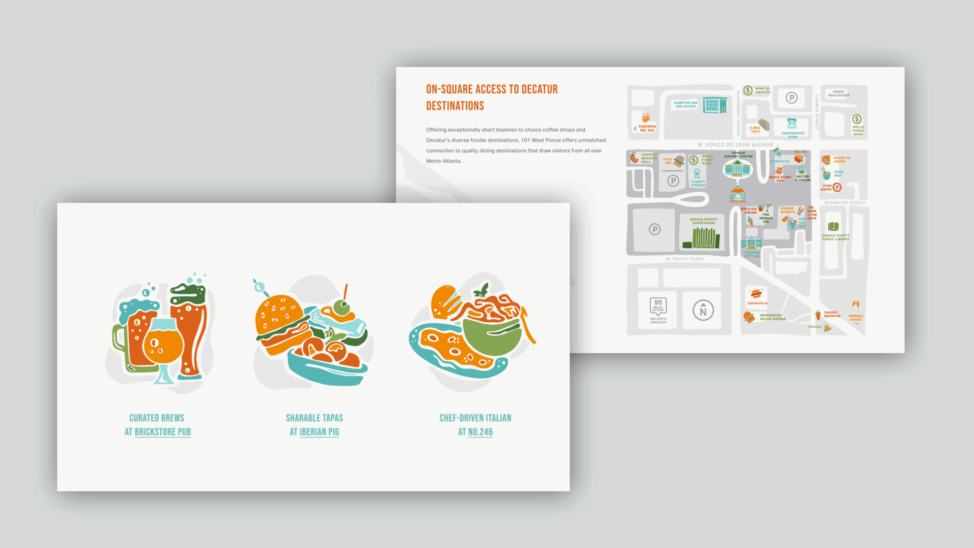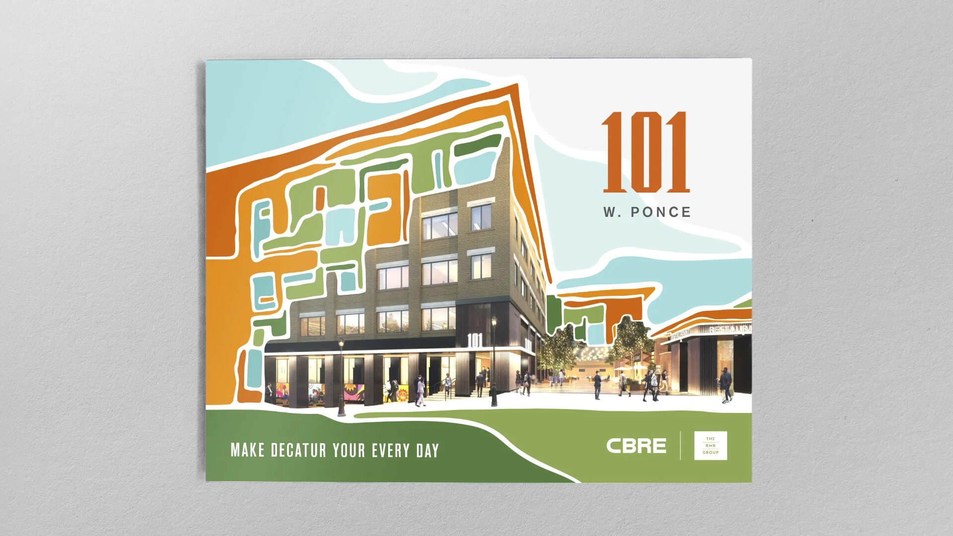 A new-to-market full-building opportunity in the highly walkable, lovable city of Decatur, we resolved to align 101 West Ponce to the energy of Decatur Square based on research and gathered insights. Through brand messaging development, we shaped an accessible, local story with a strong sense of place. Through identity development, we developed a visual language that felt genuine to the area of Decatur and fed off the liveliness of the Square. The type mark was created as a connector to blend the legacy of the building itself with the local flair of its surrounding area. It features a condensed, angular type that is bold and eye catching for a statement along West Ponce when introduced into future signage and wayfinding programs. We continued our exploration with a developed illustration style to compliment the mark’s angular type treatment. Embracing the brand’s vibrant palette and expressive style, we highlighted a curated mix of favorite Decatur amenities to elevate and educate end-users on the benefits of 101’s signature location.