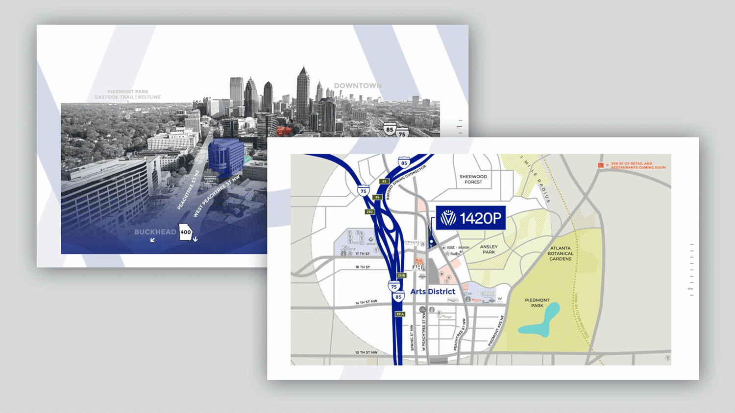 1420 Peachtree is a museum quality trophy office tower located at the intersection of Peachtree and West Peachtree Street in Midtown Atlanta. With the full-building coming available in 2021, Franklin Street Properties proactively engaged Nimble. to lead a holistic reintroduction to market campaign in tandem with architectural visioning to raise awareness for this monumental leasing opportunity. We kicked off the project with discovery research, key stakeholder interviews and a strategic naming evolution. Formerly known as ‘Pershing Point Plaza’, the evolution to ’1420P’ allowed the asset to stand on its own, helping it stand apart from surrounding workplaces using the Pershing Park as a location identifier.