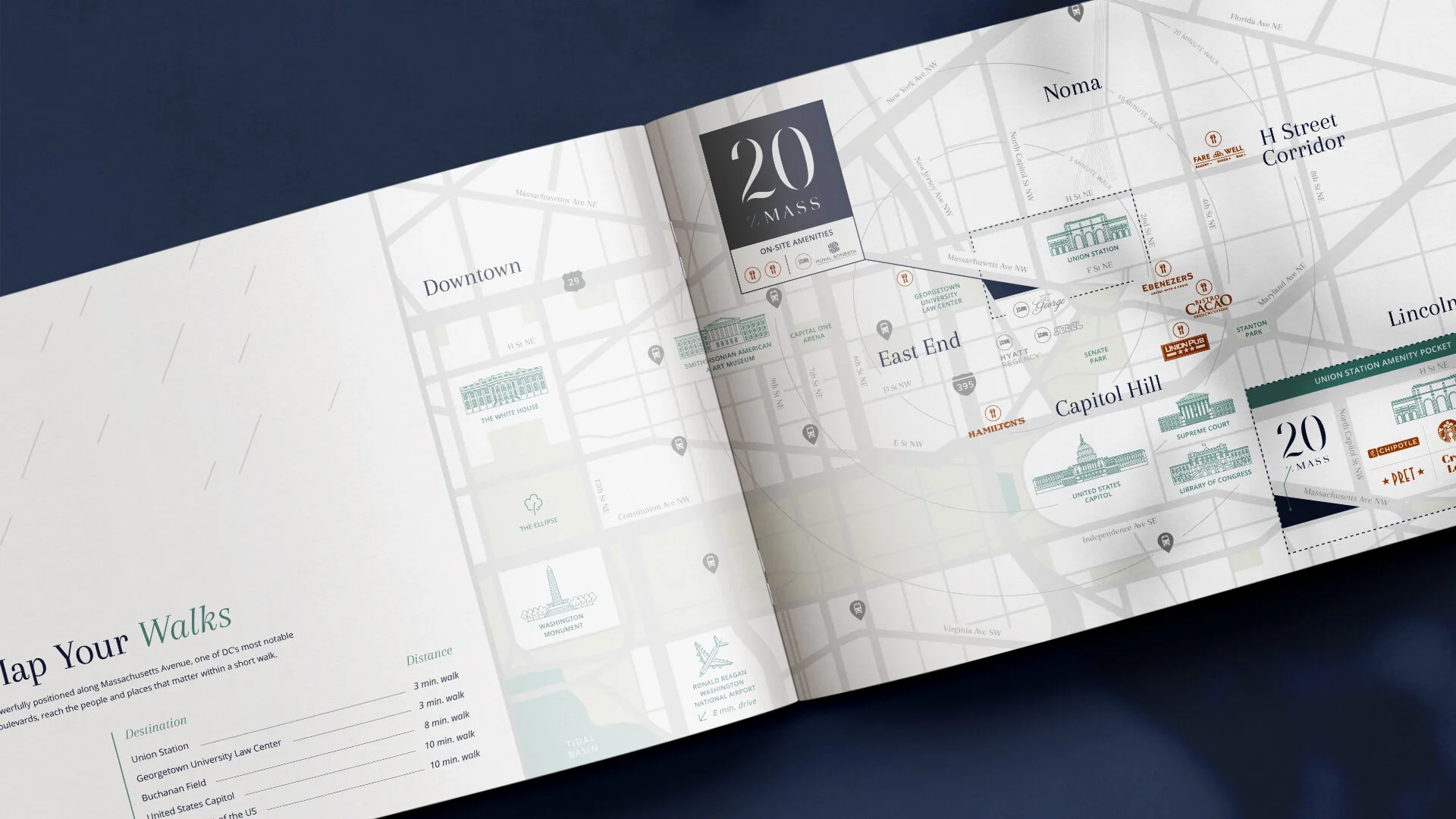 With a Discovery Phase and comp. research behind us, we selected the name “20 Mass” to tie the equity associated with its prominent Massachusetts Avenue address to the brand. Adjacent to Union Station and world-class attractions in Capitol Hill, we we crafted a narrative to position 20 Mass as a new DC destination that keeps its people moving. Through visual identity development we paired rich, bold tones with a high-end mark. The flexible system serves the the hotel, retail and office facets through a bold and kinetic resolve. Extending the brand into a development-wide brochure, extended website and e-blast campaign, we supported a strong launch to market. We remain actively engaged in on-going marketing and experiential extensions.