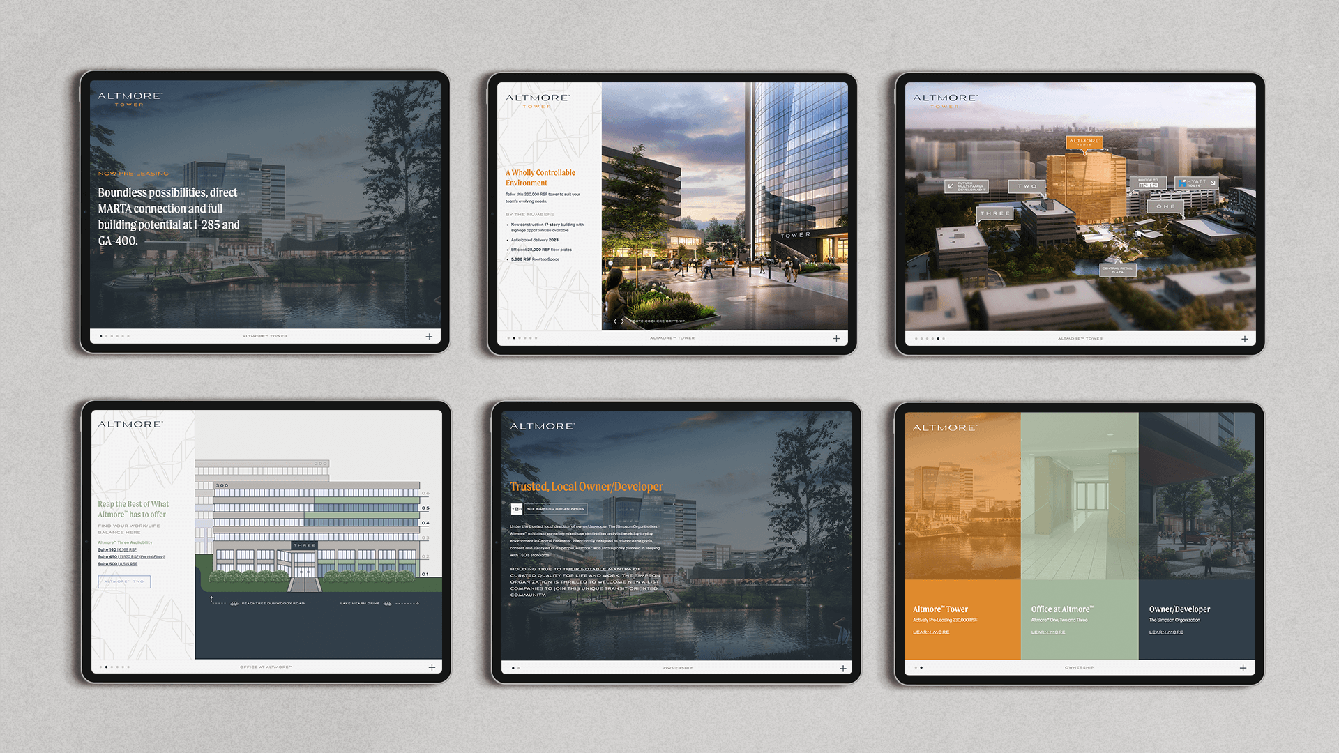 Building off of an established, three-building office core formerly known as Peachtree Dunwoody Pavilion, Altmore™ is a transit oriented, mixed-use development set to premier Class A workspace, five experiential restaurants, a Hyatt House hotel, multi-family and lake front green space in 2022. Working alongside longterm client, The Simpson Organization, Nimble. is thrilled to have led discovery, naming, brand development and interactive website and presentation design on behalf of the development at-wide. Extending the brand into the built environment, we completed garage and exterior campus wayfinding signage design as a last step to ensure a consistent and heightened pedestrian experience at Altmore™.