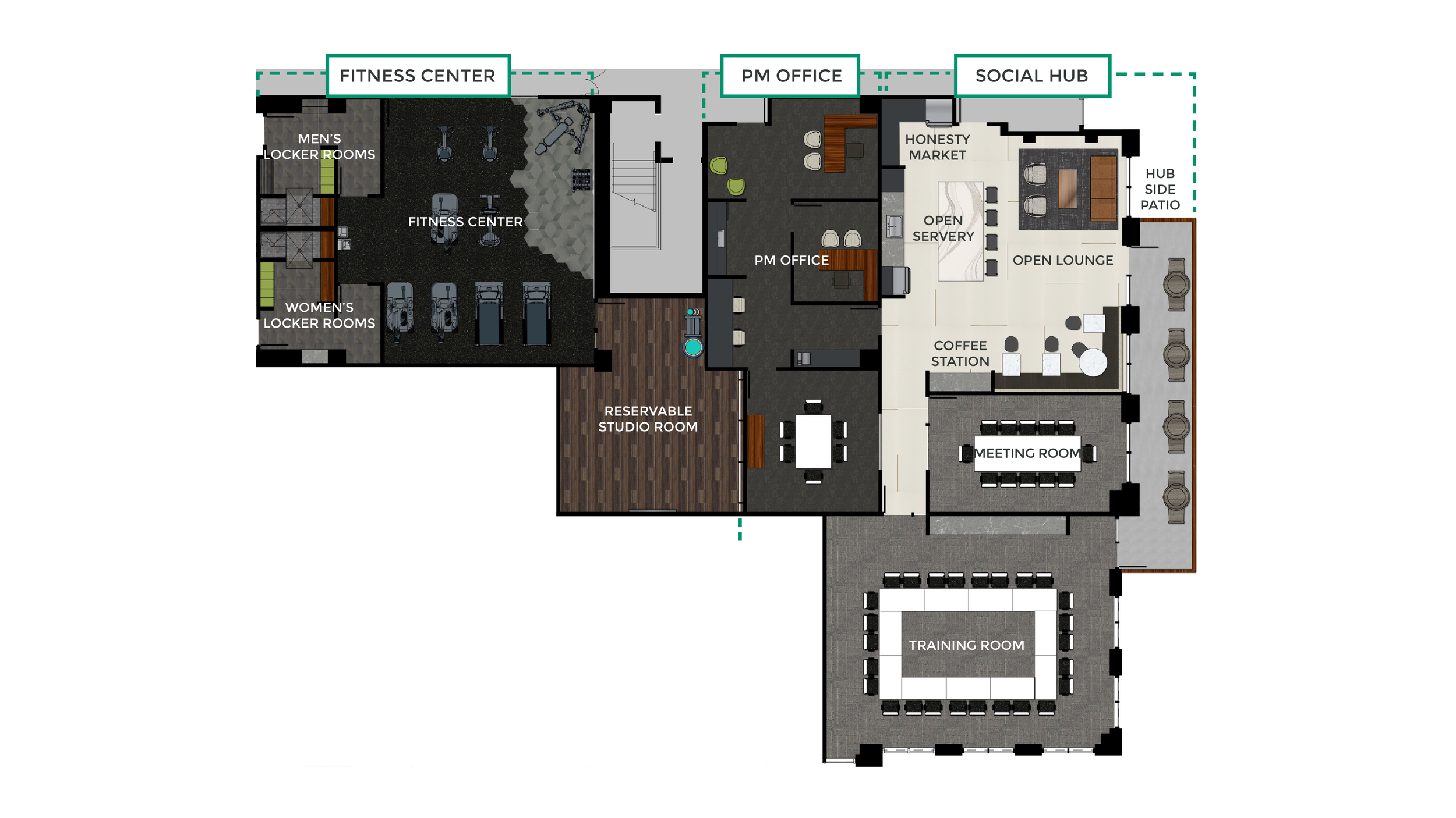 The resolved identity system consists of several marks, an earthy neutral palette, signature Bowers green, and a flexible pattern to help it stand out in a slew of similar office product. Across the construction cycle, we launched a targeted email marketing campaign to introduce the amenity experience to come. In collaboration with ASD | SKY, we designed the programming of a new amenity hub. From a coffee station with cold brew on tap to comfortable seating areas and private meeting spaces. Adjacent to the fitness studio and CORE-designed outdoor green space (debuting soon), the hub provides every opportunity to retreat and revel in third place.