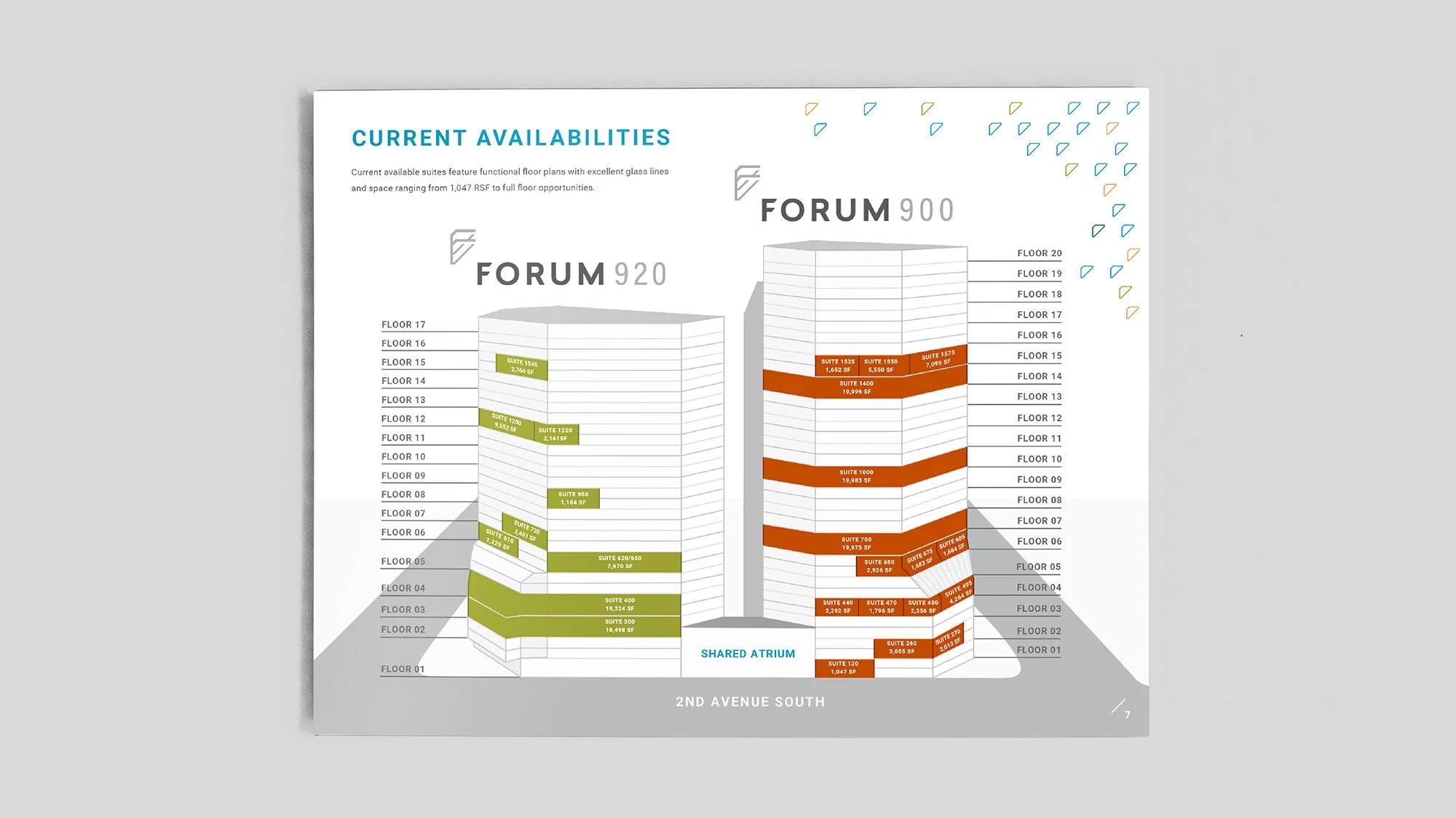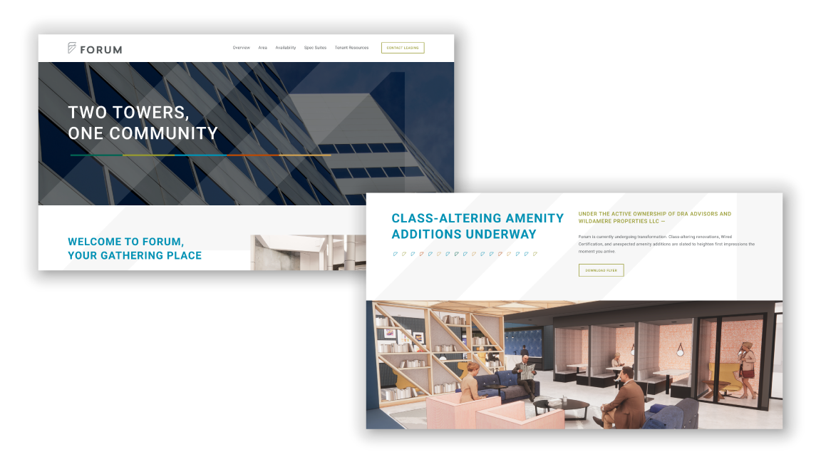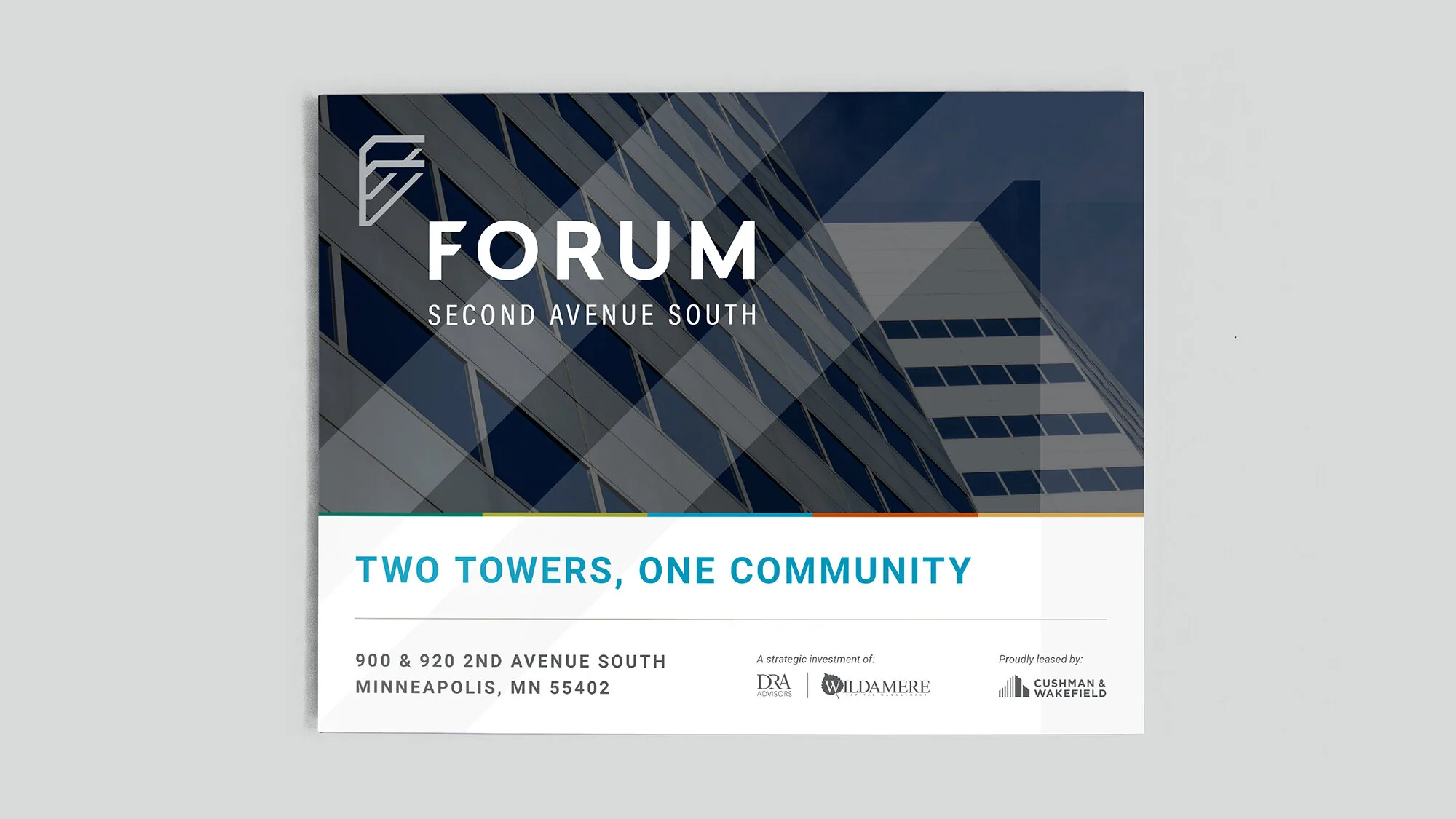 Through a naming evolution, Oracle and International Center became Forum. We transformed existing messaging staples into a brand narrative to drive home the idea of coming together under two roofs. The new visual identity system features a custom monogram logomark inspired by the connected towers resembling an ‘F’ in form. Extending renders, energetic pattern and an illustrated stacking plan across digital marketing materials, web, a physical marketing center and interior signage standards, we brought the brand to life the built environment.