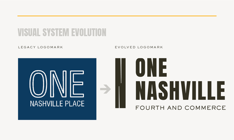 We kicked off the project with discovery research, interviews and a small naming evolution. Because ‘One Nashville Place’ was already well-recognized in the market with strong equity, we dropped ‘Place’ and added the location anchor, ‘Fourth + Commerce’ to better own the corner of two very prominent streets. Next, our team took a deep dive into brand development.