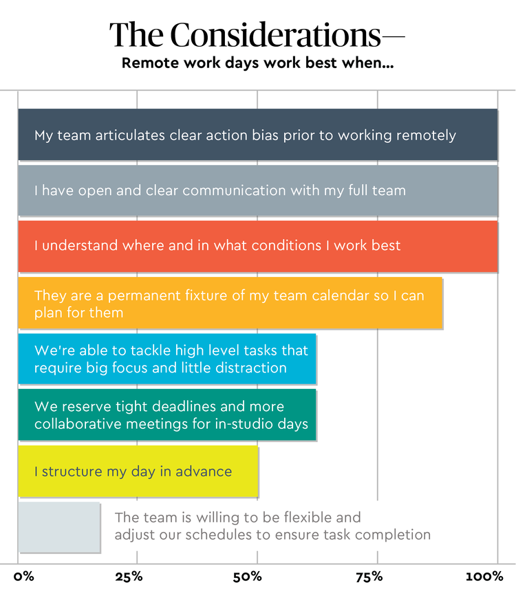 The week of your planned remote time, connect with your team to establish clear goals and action bias. Ensure each team member understands not only their own to-do list, but also what their peers strive to tackle while working remotely. Speak openly about pre-existing plans — is someone venturing offline for a planned lunch date at 1pm? Is someone jumping on a flight in the morning?