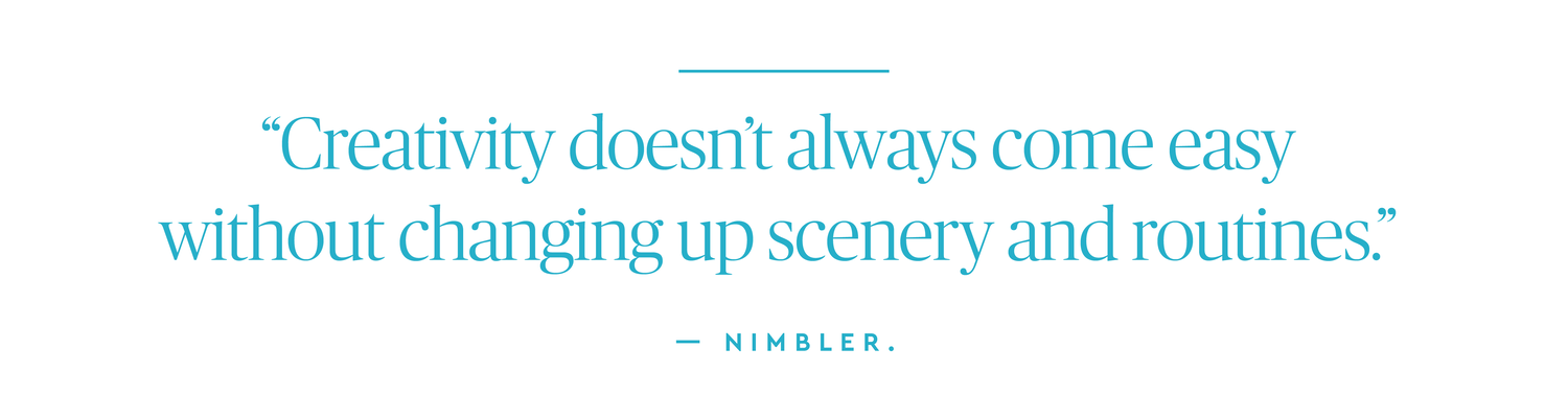 Regardless of where your do your best work daily, it’s important to notice and understand why factors like light, comfort, temperature, and sound contribute to getting work done. At Nimble., we found that our team craves natural light, controlled noise, space to spread out and ample tech (read: steady and fast wi-fi) to feel highly productive. Locale can change but these essentials ranked as critical need.