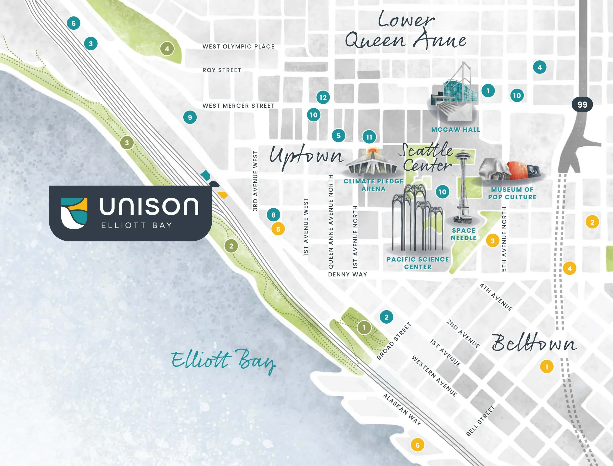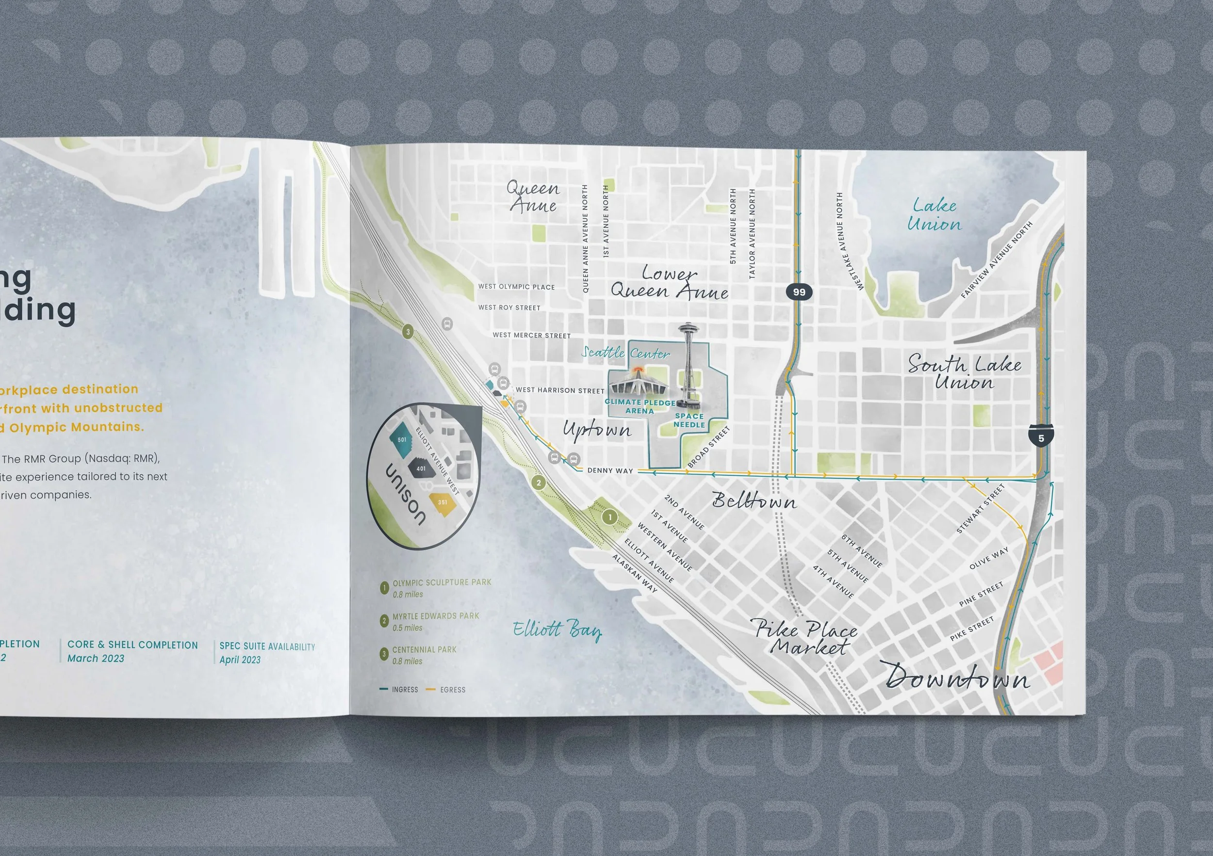 Unison is a three-building office destination located on Elliott Bay’s waterfront with views of the Puget Sound and Olympic Mountains. Undergoing revitalization directed by The RMR Group, Nimble. is thrilled to have led discovery, naming, brand development, brochure and interactive website design to accentuate a reenergized on-site experience tailored to Unison’s next generation of life science and tech-driven companies. The name “Unison” was selected to reveal the connected campus-like environment that the workplace will exhibit in 2023 paired with a story of mutual forward momentum. The fluid, organic shapes in the brand mark represent the three buildings coming together with shared amenities and direct connection to the bay. As a whole, the brand strikes a balance between the concepts of wellness and energy through the introduction of watercolor accents, large-scale renderings and elegant illustrative details that feel light and refreshing. We remain deeply engaged in extended website development as well as signage and wayfinding design and consulting.